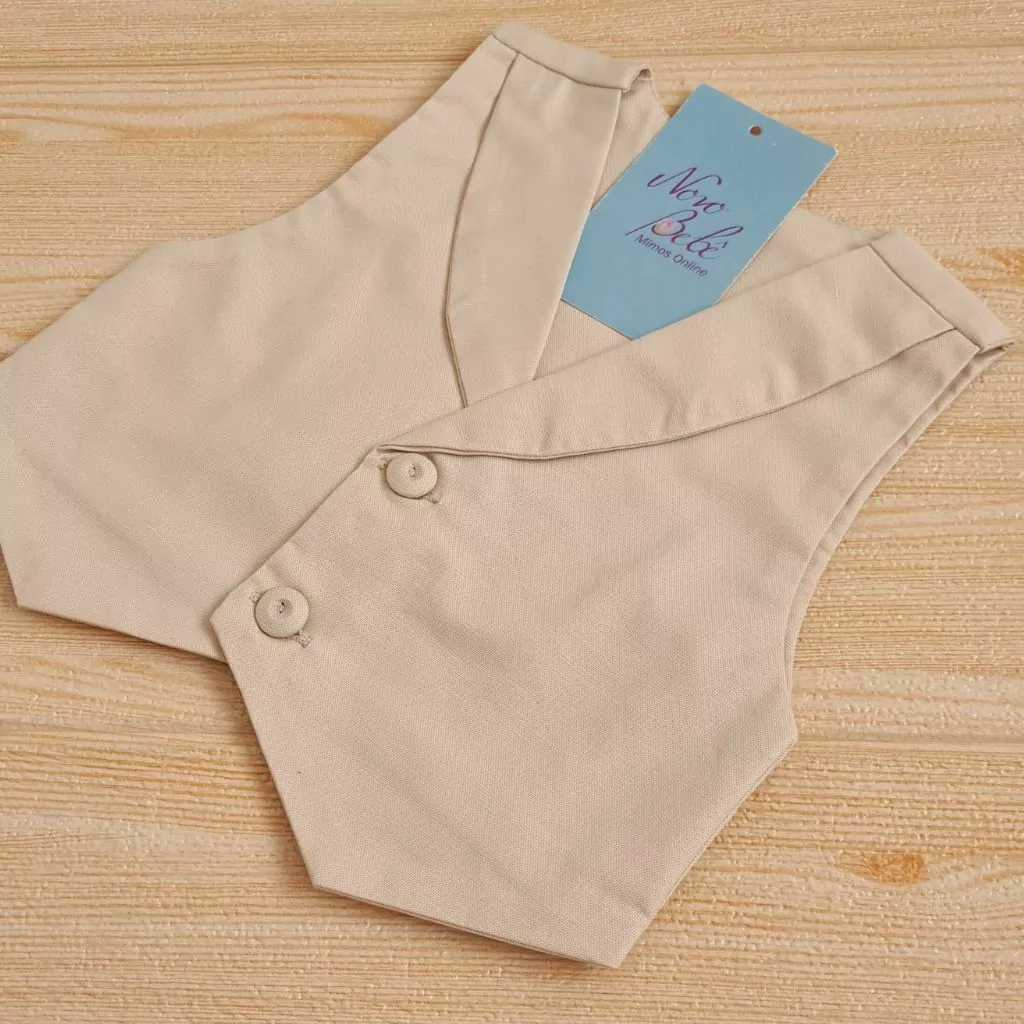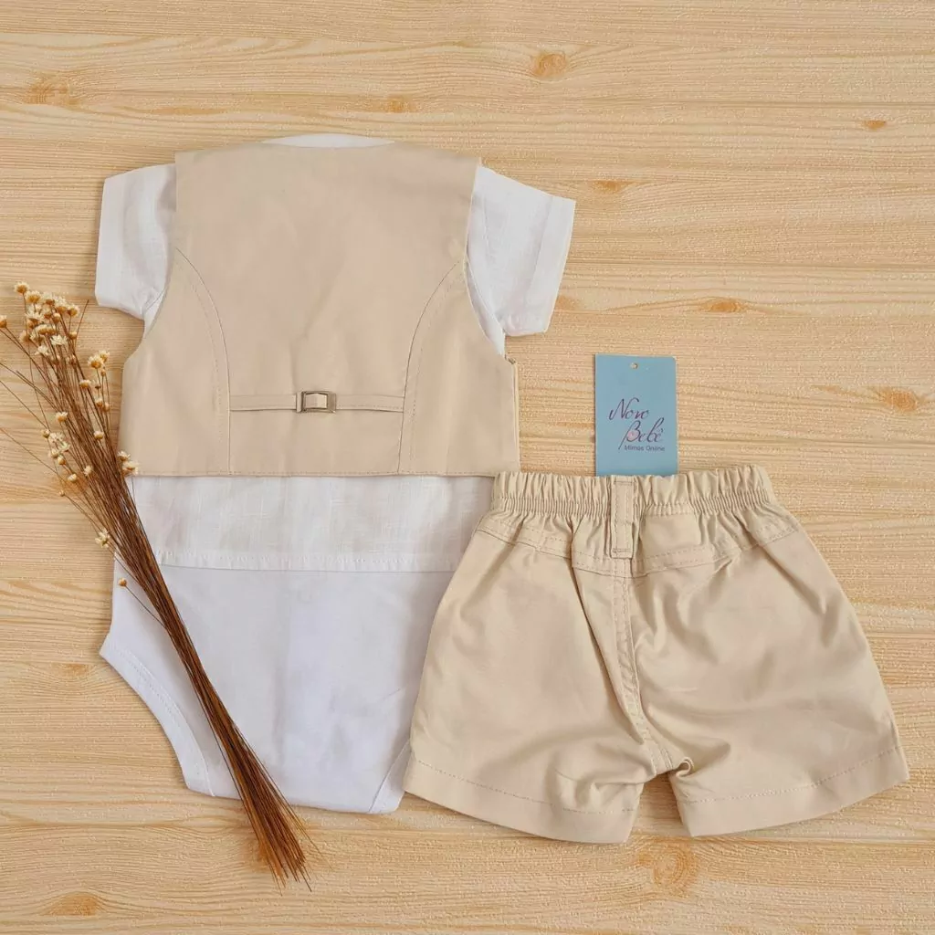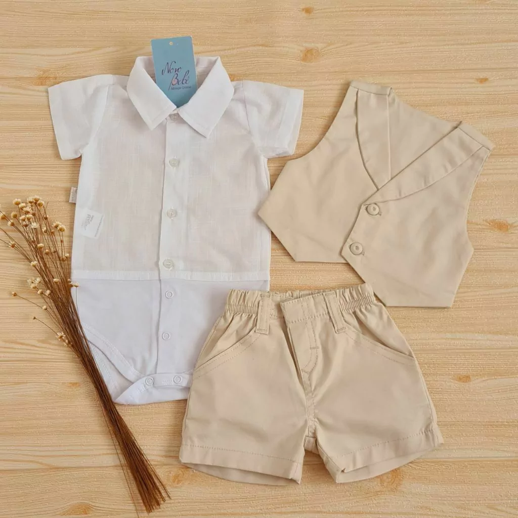 Conjunto de festa de bebê, masculino, com body camisa, shorts e colete.