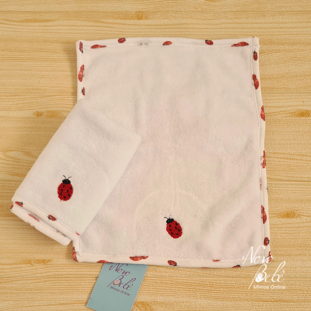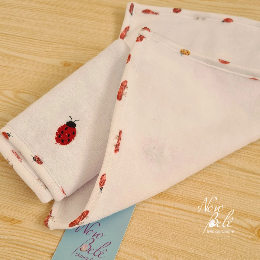 2 Fraldinhas com bordado de joaninha, e prendedor de chupeta em detalhe.