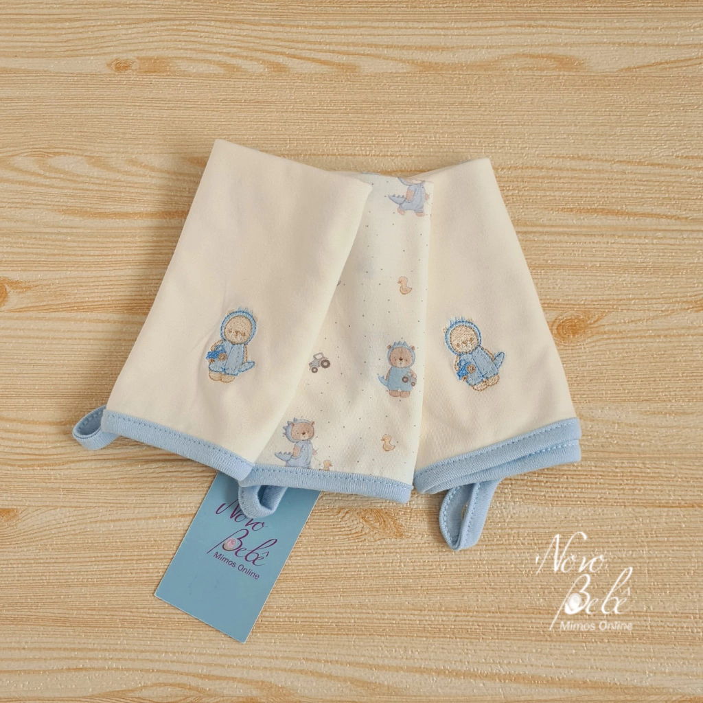 O kit é composto por 2 fraldinhas com bordado em suedine e 1 fraldinha em suedine estampado.