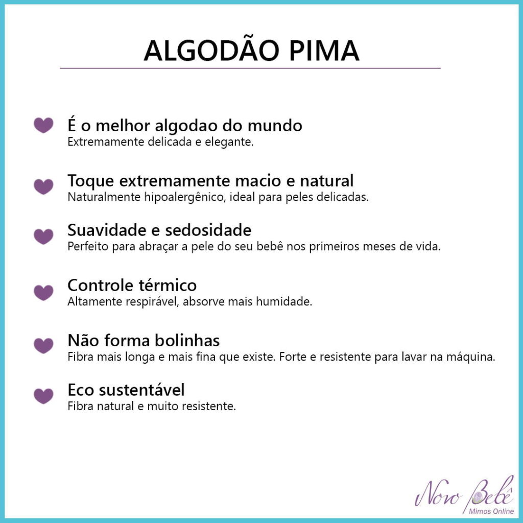 Com um comprimento de fibra bem superior ao algodão tradicional, o algodão pima é sinônimo de qualidade e durabilidade, para vestir com muito mais carinho se baby.