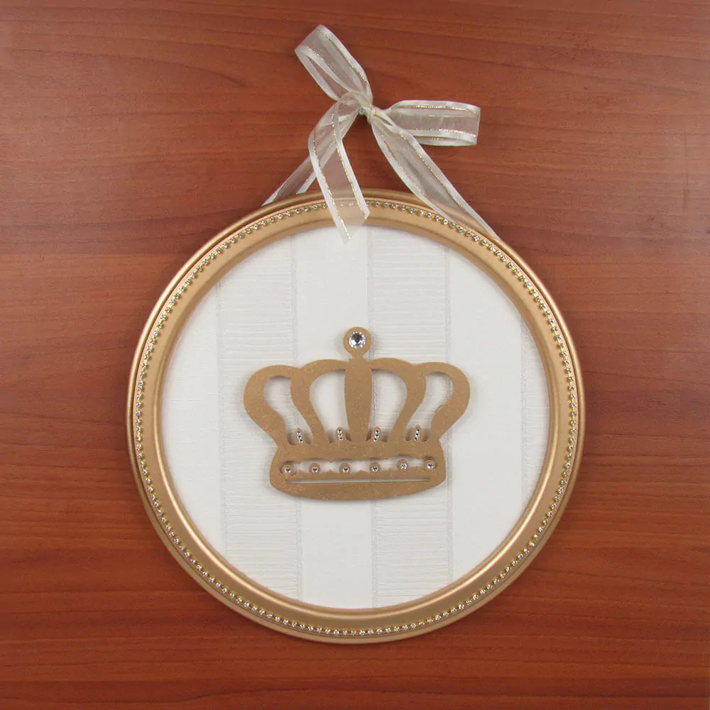 Coroa em MDF dourado com cristais aplicados.